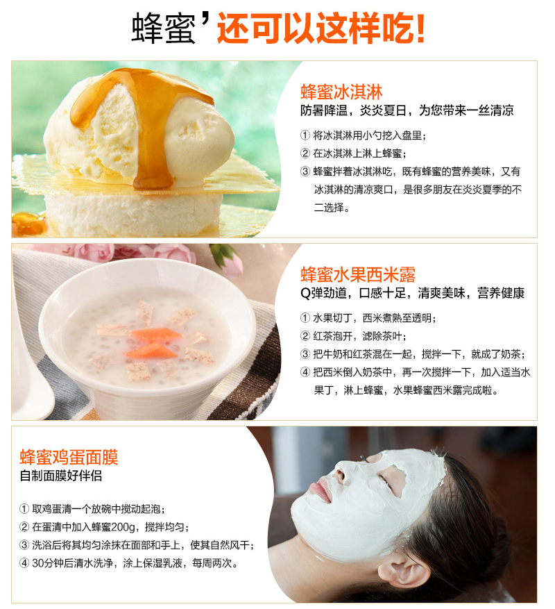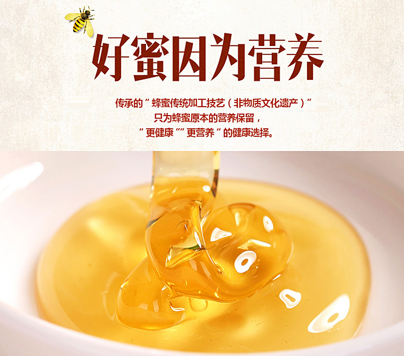 原料符合欧盟标准的高纯度、低水份多花型蜂蜜,会因不同季节、不同花型,而产生颜色和结晶,这是优质蜂蜜的正常物理性。品质不变,口感醇香。