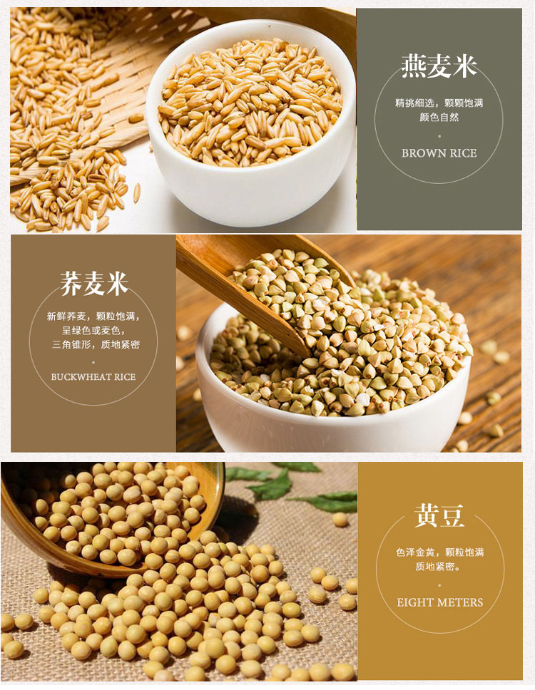 420g大麦米、400g荞麦米、350g黄豆、400g燕麦米、410g糙米、420g白豌豆